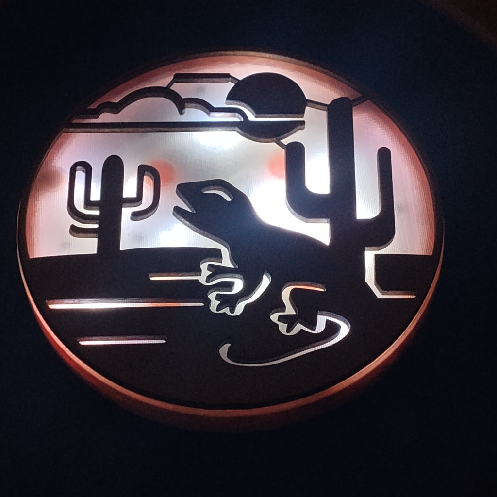Experience the perfect blend of form and function with our LED coasters. Crafted in America using 3D printing technology and laser cut wood, our coasters feature mahogany, bubinga, zebra and walnut wood for a sleek and exclusive look. With LED lights powered by batteries, these coasters can be customized with unique designs and personalization. Elevate your drink and protect your surfaces in style with Rum Dawgs Creations LED coasters. This listing is for "Desert Oasis", you can choose from 10 base colors and 4 wood species. Each coaster top is made to order, bulk orders will obviously take time to fulfill.